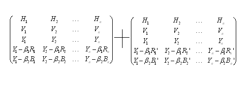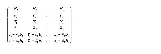 現(xiàn)行的彩色電視系統(tǒng)中,由行向量H,幀向量V,亮度向量Y組成的,表達彩色信息的是由紅向量R,綠向量G,蘭向量B的三維線性空間。也可用以下的矩陣來表示: