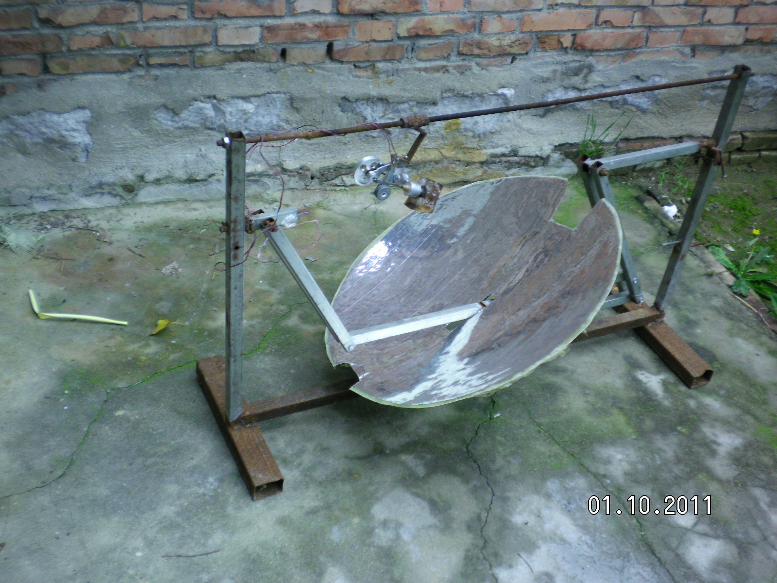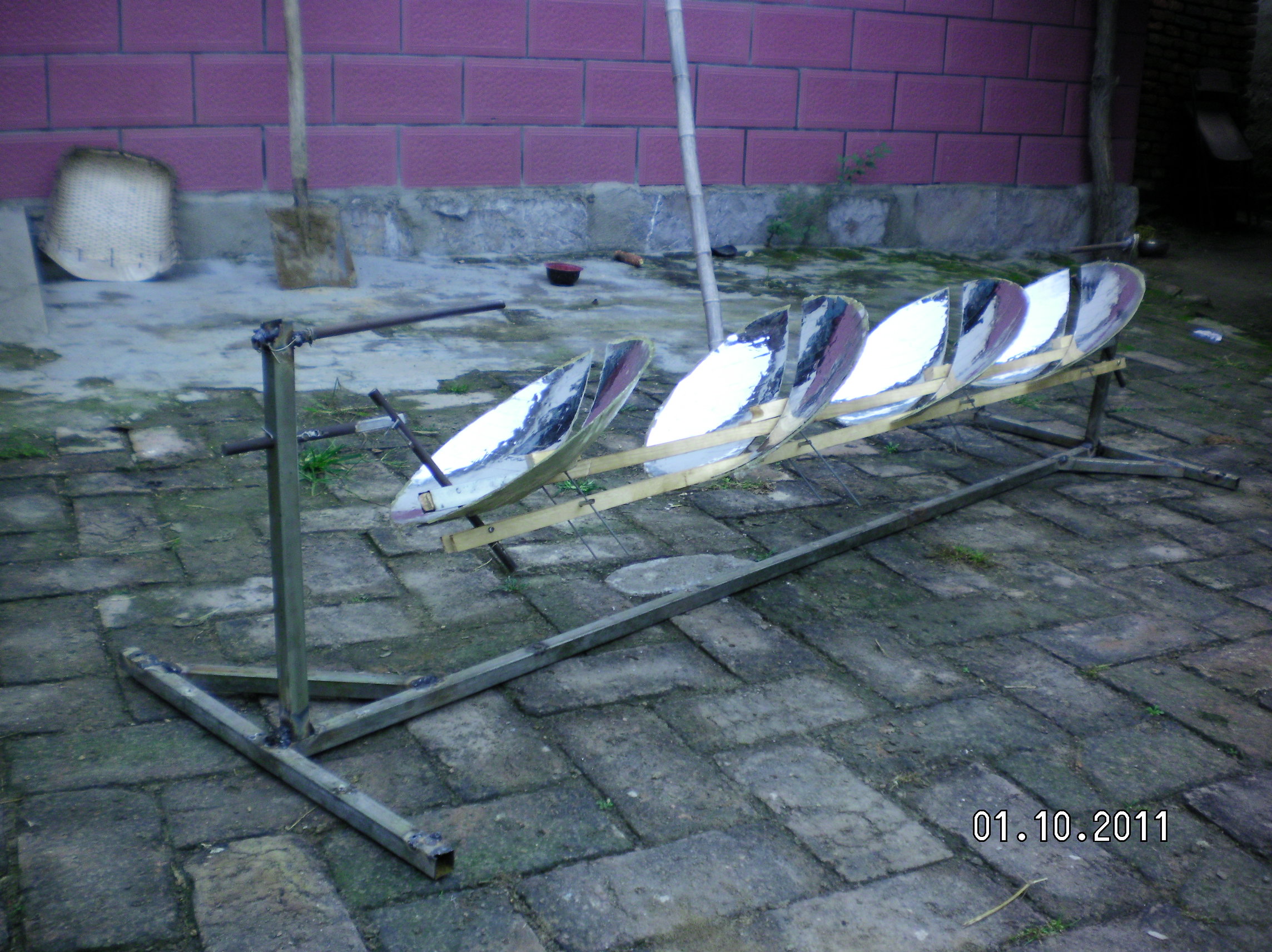 隨著全球環(huán)境惡化和日益嚴(yán)峻的能源形勢(shì)世界各國(guó)對(duì)太陽(yáng)能熱發(fā)電越來(lái)越重視?,F(xiàn)在最常用的太陽(yáng)能熱發(fā)電系統(tǒng)主要有槽式、蝶式和塔式,槽式和蝶式的光熱部件必須隨聚光鏡做相應(yīng)的運(yùn)動(dòng),槽式各個(gè)光熱部件復(fù)雜昂貴,蝶式光熱部分只能單獨(dú)使用塔式的受熱部分出現(xiàn)故障很難維修這三種系統(tǒng)都有自己的缺點(diǎn)。基于此我設(shè)計(jì)了平行定焦太陽(yáng)能聚光集熱發(fā)電系統(tǒng):主要有一對(duì)支柱.一對(duì)轉(zhuǎn)軸.一對(duì)動(dòng)臂.旋轉(zhuǎn)拋物面聚光鏡.一根托桿.一根平行桿.平行連桿組成將兩支柱固定在一條直線(xiàn)上,兩轉(zhuǎn)軸安裝在兩支柱上兩轉(zhuǎn)軸可以左右轉(zhuǎn)動(dòng),兩動(dòng)臂安裝在兩轉(zhuǎn)軸上使可以隨轉(zhuǎn)軸左右前后擺動(dòng)。托桿安裝在兩動(dòng)臂上,平行桿與托桿平行安裝在兩動(dòng)臂上,這樣動(dòng)臂.托桿.平行桿構(gòu)成一個(gè)平行凹框。在旋轉(zhuǎn)拋物面鏡原點(diǎn)安一橫軸并切去部分旋轉(zhuǎn)拋物面鏡,在橫軸兩端垂直安裝兩根平行連桿,把旋轉(zhuǎn)拋物面鏡的橫軸安裝在托桿上。在平行桿上安裝連桿軸把平行連桿與連桿軸連接在一起。所述旋轉(zhuǎn)拋物面鏡的焦距等于托桿與轉(zhuǎn)軸之間動(dòng)臂的長(zhǎng)度。將動(dòng)臂對(duì)準(zhǔn)太陽(yáng)陽(yáng)光就會(huì)聚焦到固定點(diǎn)上在這些位置安裝光熱部件就會(huì)得到熱能用于熱發(fā)電。這種結(jié)構(gòu)是雙軸定焦所以效率很高,抗風(fēng)性好。這種結(jié)構(gòu)可以做成很小裝在高在15-20cm的透明罩內(nèi)安裝在樓頂或樓房南墻上,為人們提供開(kāi)水或蒸汽。請(qǐng)看模型照片: