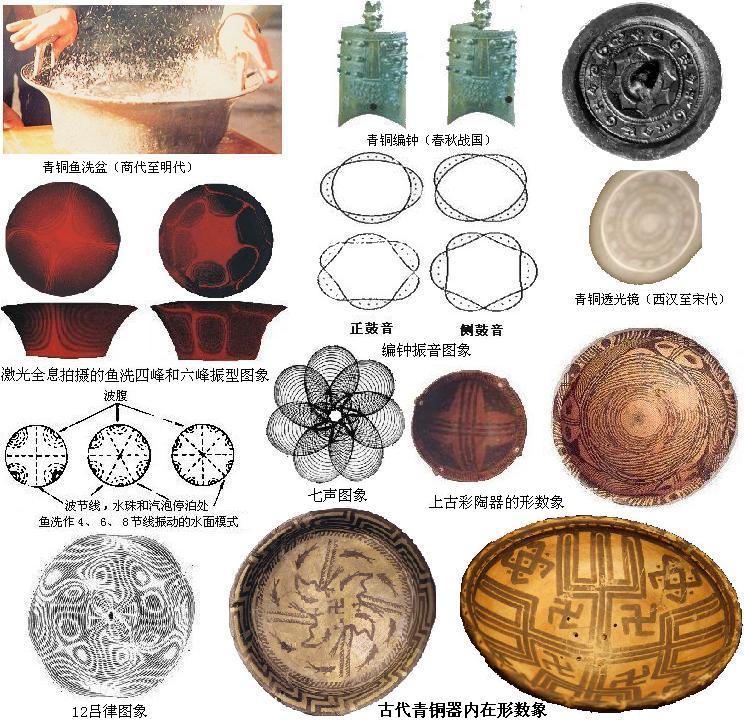 彩陶上的圖象和圖形,展現(xiàn)了上古文明的陳跡,是上文明的結晶,古埃及是幾何圖形見長,中國上古除了簡單幾何圖形,更多是形數(shù)象。五千年前,文字的發(fā)明,同時青銅器開始出現(xiàn)。中國中古夏代是由陶器向青銅器過渡的時期,殷商能鑄造精美的金器和青銅器。金屬所制的器物比粘土燒制的陶器更具活力,振動聲播、熱導電傳,比陶器優(yōu)越得多,好比近代的機械的熱動性、近現(xiàn)代電氣的電動性,現(xiàn)代電子的信息性,技術不斷更新。中古的青銅器治金和鑄造技術,沒有現(xiàn)代技術先進,但青銅器一此特殊功能,卻令現(xiàn)代人嘆為觀止,難以模仿。青銅器關鍵是內在的器構,不是外部形體結構。商代為青銅器發(fā)展的頂盛時期,其鑄造技術一直延續(xù)至明代的近代機械鐵器鑄造興起才失傳。要問中國古代科技成就,眾人熟知的活字印刷、造紙、火藥、指南針的四大發(fā)明,這些都是小科技。中國古代高端科技是供人玩樂的中華青銅三大寶,魚洗盆、編鐘、透光鏡,其深藏科學的大道理。如圖〖古代青銅器內在形數(shù)象〗所示,經激光全息拍攝,青銅器內在振動圖象,正是上古彩陶上的形數(shù)象,摩擦叩擊,洪鐘音樂,透光鏡正面采光,背現(xiàn)影像。中華青銅三大寶展示了中國古代科技工藝,采用了高超的系統(tǒng)數(shù)理,八卦符只是系統(tǒng)工具,形數(shù)象才是系統(tǒng)數(shù)理核心。