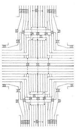 圖1是實用新型的橋體結(jié)構(gòu)圖路口的中間部位為縱向高架橋101,供縱向直行車輛通過路口,路口兩端架設(shè)縱向路面橋102(上起一高架車道),橫向中間直行車道103為雙盆形地下車道,縱向高架橋101下方隆起至地面,盆底部位上方為縱向路面橋102,車行道路不架設(shè)橋墩,縱向路面橋橋基(代橋墩)104、縱向高架橋橋基105(代橋墩)占用各轉(zhuǎn)彎掉頭車輛共用橫向車道路基。縱向高架橋橋墩位于橫向道路中心線上所標101位置。