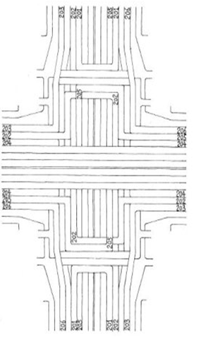 兩橫向左轉(zhuǎn)彎車道202分別通過兩縱向路面橋?qū)崿F(xiàn)無交叉左轉(zhuǎn),橫向左轉(zhuǎn)彎車道202分別穿越縱向路面橋上的縱向左轉(zhuǎn)彎高架車道。兩縱向左轉(zhuǎn)彎車道205分別通過兩縱向路面橋上的高架車道實現(xiàn)無交叉左轉(zhuǎn),縱向左轉(zhuǎn)彎車道205跨越縱向路面橋上的橫向左轉(zhuǎn)彎車道202。