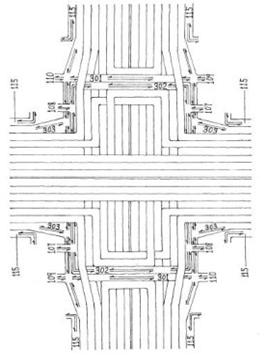 開放型人行道115進入路口前讓位于電動車道??v向電動車道301人行道302位于兩端路面橋上的橫向掉頭車道與縱向高架車道的中間,兩端分別穿越右轉(zhuǎn)彎車道(高度以電動車行人順利通過為宜)。人行道出入口107、108跨越電動車道,人行道出入口107-108之間(橫向)為地下通道穿越各縱向車道(高度以電動車行人順利通過為宜)。電動車道出入口109-110之間(橫向)為地下通道,穿越人行道入口107、108和各縱向車道(高度以電動車行人順利通過為宜)。