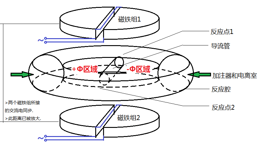 如圖, 兩組電磁鐵平行放置, 反應腔夾于磁鐵之間. 每個電磁鐵組水平均分為兩半, 中間以狹縫隔開. 其線圈繞組使得在通交流電時兩半的磁場方向相反, 大小相同. 兩組電磁鐵通以同步高頻交流電, 于是就可以使兩組電磁鐵之間的半邊磁通量變化, 從而在反應腔所在的位置產(chǎn)生渦旋電場. 兩邊的渦旋電場在反應腔中部橫穿的導流管處疊加. 導流管兩端自然產(chǎn)生主、副對撞點, 即反應點1和2. 反應腔內同時還存在水平方向同軸的環(huán)形磁場(此點與托卡馬克相同), 用于約束粒子沿環(huán)形軌跡運動, 并在反應點處收緊以壓縮等離子體.