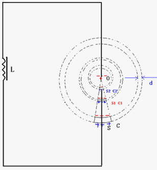 如圖3,在一個(gè)由“點(diǎn)電極”O(jiān)與“球冠電極”S組成的“球錐空間”中,如果O與S之間產(chǎn)生了足夠的“特高電壓”,那么這個(gè)“球錐空間”就可以被“雙向激擊”,依次連續(xù)發(fā)生“球冠振蕩”……、S2、……、S1、……、S,產(chǎn)生不同頻率的“電磁波”,并且呈“嵌套球狀”分布,由外到里即由球冠S到點(diǎn)O,產(chǎn)生的“電磁波”的頻率越來越大。由外向里,由球面向球心,產(chǎn)生的電磁波的頻率可以從“可見波”頻率,逐漸增大,有的可以達(dá)到紫外線頻率、X射線頻率,甚至出現(xiàn)伽馬射線頻率。[3][4]