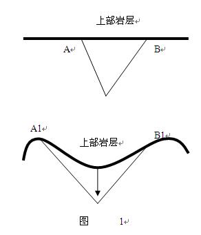 冰輒理論認(rèn)為:地殼運(yùn)動與巖漿無關(guān),它是地殼自身結(jié)構(gòu)關(guān)系的進(jìn)一步調(diào)整,是地殼自身重力作用的結(jié)果。至于山脈的形成,我認(rèn)為同樣與地下斷裂密切相關(guān),地下斷裂是地質(zhì)活動的結(jié)果,地下斷裂的的擴(kuò)大與發(fā)展更是地質(zhì)活動的基本運(yùn)動形式。隨著地下斷裂的擴(kuò)大與發(fā)展,底層斷裂區(qū)域承壓能力逐漸降低,上部巖層也因地下斷裂的擴(kuò)大,最終發(fā)生自身重力作用下的區(qū)域性沉降。如圖1所示AB、A1B1為斷裂上部的巖層,初始階段斷裂較小上部巖層AB無彎曲,隨著時間的推移斷裂逐漸增大斷裂上部巖層在重力作用下逐漸發(fā)生彎曲(如A1B1所示),這時,區(qū)域性沉降的上部巖層的兩端A1、B1處相對隆起,產(chǎn)生褶皺,這就形成了山脈。
