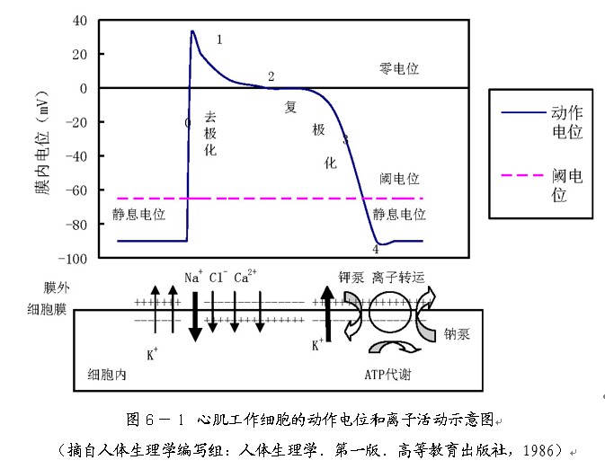 在上圖中,去極化(0期),心肌細(xì)胞受刺激后,靜息電位到達(dá)閾電位時(shí),迅速激活鈉通道,使其開放,造成大量鈉離子內(nèi)流,動(dòng)作電位迅速升高,鈉通道又迅速失活關(guān)閉;快速?gòu)?fù)極化初期(1期),鈉離子內(nèi)流停止,氯離子通透性升高,氯離子內(nèi)流,氯離子通道通透性也迅速下降;緩慢復(fù)極化期(2期),鈣離子緩慢內(nèi)流,與此同時(shí),少量鉀離子外流,鈣離子通道的激活和失活過(guò)程均緩慢,故稱慢通道;快速?gòu)?fù)極化末期(3期),鉀離子外流;靜息期(4期),此期離子轉(zhuǎn)運(yùn)活躍,即把動(dòng)作電位形成期間流入膜內(nèi)的鈉離子,氯離子,鈣離子排出,又把外流的鉀離子攝回,這一過(guò)程通過(guò)心肌細(xì)胞膜上的Na+-K+泵的作用完成的,需要消耗ATP的生理過(guò)程。(本小節(jié)內(nèi)容摘自人體生理學(xué)編寫組:人體生理學(xué).第一版.高等教育出版社,1986)