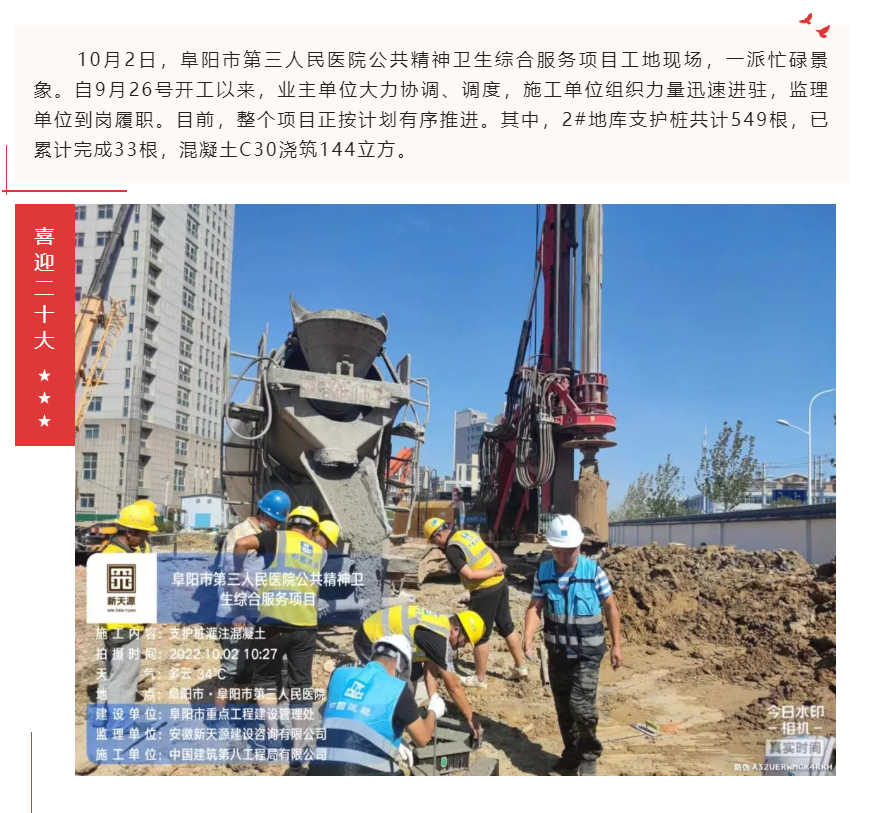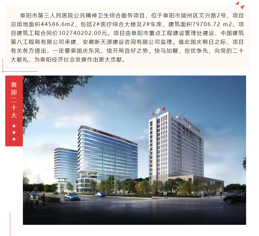 全力開新局 獻(xiàn)禮二十大 ——阜陽市第三人民醫(yī)院公共精神衛(wèi)生綜合服務(wù)項目巡禮 作者: 安徽新天源建設(shè)咨詢有限公司 最后修訂: 2022-10-03 16:43:01 摘要: