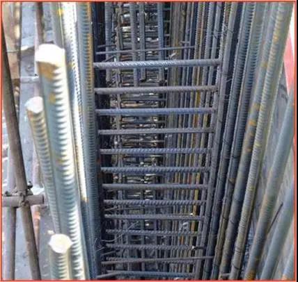 鋼筋加工:I級鋼筋末端需做180°彎鉤,彎曲直徑D取鋼筋直徑d的5倍,平直部分長度取鋼筋直徑d的5倍;箍筋彎鉤135°、平直部分長度取10 d。鋼筋定位鋼筋端頭應切齊、磨去飛邊毛刺,端頭刷防銹漆。