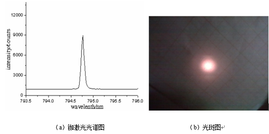 電子所是在國內(nèi)率先開展DPAL研究工作的單位之一,2012年5月,電子所實現(xiàn)了半導(dǎo)體泵浦線偏振基模銣激光輸出,經(jīng)繼續(xù)對實驗進行改進,獲得了最高2.8W的銣激光輸出,光光轉(zhuǎn)換效率達(dá)21%。實驗光路如圖2-7所示,實驗測量的銣激光光譜以及光斑如圖2-8所示。