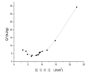 如圖3-5所示,單位面積除漆質(zhì)量先是隨著能量密度上升,在能量密度為6~8 J/cm2之間達(dá)到峰值,隨后下降。當(dāng)激光能量密度大于12 J/cm2后,單位面積除漆質(zhì)量顯著下降,此時,激光與樣品表面的作用機理可能已發(fā)生突變。而進一步分析Q*值(Q*=激光能量密度/單位面積除漆質(zhì)量)隨能量密度的變化曲線,如圖3-6所示??梢钥闯?,當(dāng)能量密度大于10 J/cm2后,Q*值隨著激光能量密度的提高大幅提高,說明激光能量的利用效率顯著下降。且在入射激光能量密度為6.5 J/cm2時,Q*值為極小值,約為3 kJ/g。