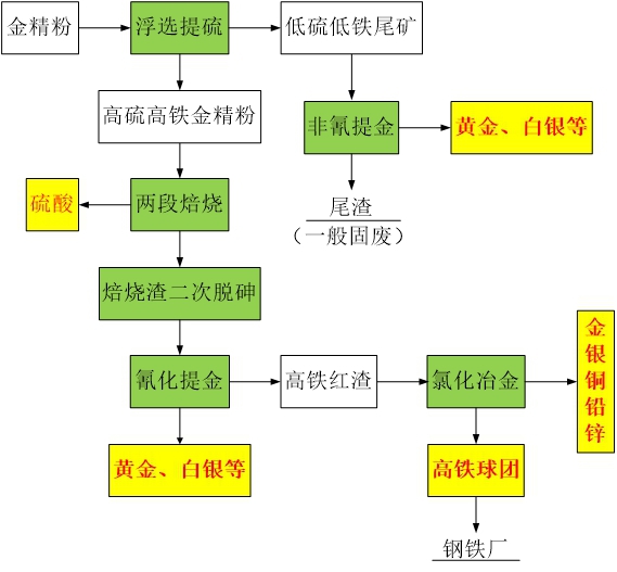 我們提出了黃金未來發(fā)展的一個思路。黃金綠色選冶技術(shù)包括以下三個部分:難選冶金精粉硫鐵富集選、兩段焙燒?氰化提金(含焙燒渣二次脫砷)、高鐵紅渣高值化綜合利用、尾礦非氰提金。終端產(chǎn)品包括金、銀等貴金屬、硫酸、銅、高品質(zhì)煉鋼粒鐵(球團(tuán))等。該流程產(chǎn)業(yè)鏈結(jié)構(gòu)完整,實現(xiàn)真正意義上的資源循環(huán)利用;綜合回收礦物中的金、銀、銅、鉛、鋅等有色金屬和鐵,各有價元素的資源化利用得到最大化,避免了資源浪費;實現(xiàn)了氰化尾渣的無害化利用,整個過程沒有危險固廢產(chǎn)生,廢氣達(dá)標(biāo)排放,水循環(huán)使用無外排;能夠處理多元素含砷復(fù)雜金精礦,對原料的適用性強(圖4)。
