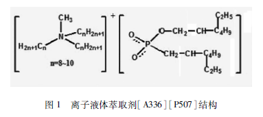 近年來我們開展離子液體萃取劑的研究,例如[A336 ] [ P507]。該結構簡單的理解就是將P507進行有機錢鹽的皂化,有機錢鹽常采用Aliquat336,國內商品名稱為N263。[ A336 ] [ P507]的結構如圖1所示,是一種典型的離子液體,所以我們稱之為離子液體萃取劑。