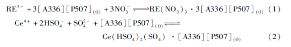 離子液體萃取稀土離子的過程機理還是比較復雜的,這種復雜來自于很多方面。其萃取稀土(III)和缽( IV)的機理還是以中性絡合機理為主,如萃取平衡方程(1)和(2)所示,同時可能還伴隨一些副反應。該過程萃取稀土鹽,酸堿消耗比較小,是提高稀土萃取效率的重要方式之一。