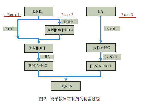 離子液體萃取劑的制備過程如圖2所示,包括將季錢鹽[R4N ]C1制備成季錢堿[R4N ]OH,然后與有機酸HA反應生成[R4N]A?;蛘邔⒂袡C酸HA與堿反應生成A一Na,然后與[R4N ]C1反應生成[RQN]A。前一個制備過程,尤其是利用KOH更加簡單、低成本,產品的純度高。此外,離子液體萃取劑制備過程簡單,反應時間短,條件溫和,產品收率高,適合大規(guī)模的生產。申請者利用工業(yè)原料N263 ( Aliquat336的國產化的商品)與P507制備的[A336][P507]價格僅為170元/千克左右。另外,離子液體萃取劑性質穩(wěn)定,經過多次循環(huán)仍保持其萃取性能。此外,其水溶性較低,溶解度一般小于50ppm。這些都符合大規(guī)模工業(yè)應用的潛在條件。