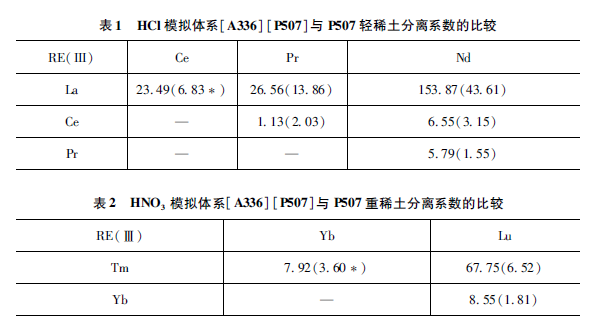 P507(III)萃取稀土按照正序萃取,遵循“四分組效應”,稀土的分配系數(shù)隨著原子序數(shù)的增加而增大,而堿性萃取劑[A336]C1在HN03體系中通過陰離子交換萃取稀土是倒序萃取,稀土的分配系數(shù)隨著原子序數(shù)的增加而減小。兩種效應共同作用,導致[A336 ] [ P507 ]分離稀土選擇性增強,相鄰元素間的分離系數(shù)明顯提高。同時,陽離子[A336]+和陰離子[P507 ]-的離子半徑大,空間位阻增加,也有助于提高稀土(III)的萃取選擇性。模擬實際體系的組分混合物,在HCl體系中在輕稀土間的分離系數(shù)也有較大的提高,尤其是Pr/Nd分離系數(shù)5. 79明顯高于P507體系的1. 55(徐光憲主編,《稀土》,第二版,1995 ) ,見表1。在HN03體系中重稀土Tm/Yb/Lu的分離系數(shù)較大,明顯高于目前的P507體系(李德謙等,中國發(fā)明專利,ZL200510016682. 6 ),見表2。[A336 ] [P507 ]的特殊結構對部分稀土離子分離的選擇性方面比較突出,與其較大的空間位阻有關。