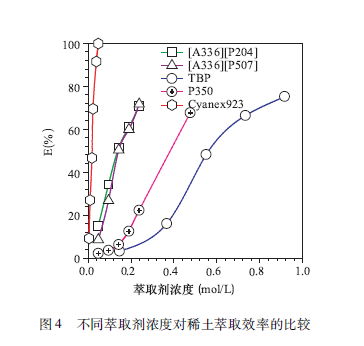相同條件下在硝酸體系中萃取能力順序比較:TBP(磷酸三丁醋)< P350(甲基磷酸二甲庚醋)< [A336] [P507] < Cyanex923(圖4)。盡管Cyanex923是萃取稀土的優(yōu)良萃取劑,但成本比較高,且難以國產化,實際應用中還是受到一定的影響。[A336 ] [ P507」的優(yōu)勢還體現(xiàn)在酸堿消耗低,反萃取完全。