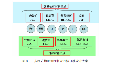 為實現(xiàn)上述目標,弱磁鐵礦磁化與稀土礦物分解一步法礦物重組機制及目標遷移設計方案如圖3所示。