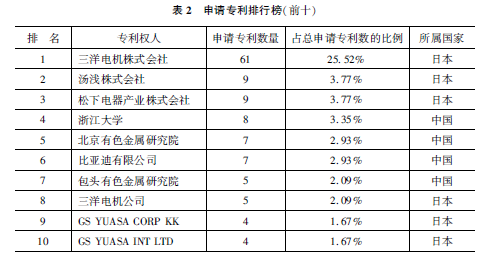 從不同年份上來看,中國專利不斷增加,原來口本比中國多,后來中國慢慢增多。但實用的還是不多,仍然還是一個問題,還得有進一步的提高。另外,從申請單位來看,排在前十名的都是中國和口本的一些單位(表2)。比如說三洋電機株式會社、湯淺株式會社、松下電器產業(yè)株式會社、浙江大學、北京有色金屬研究院、比亞迪等。