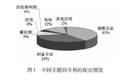 這里面是不同的研究主題分布,還是以儲氫合金的開發(fā)居多一點,然后還有催化劑、改性等(圖1)。我覺得在這里面可能有三個領域在技術上發(fā)展比較突出一點。第一個就是成分的改變,通過改變儲氫合金成分開發(fā)新的合金提高了鎳氫電池容量,是一個很重要的進步。傳統(tǒng)是ABS型的,后來跟ABS型的和AB2型的結合到一起,就變成了A2B7型的,這就是口本三洋公司開發(fā)出來的。這個儲氫合金成為了目前研究的主流,容量比傳統(tǒng)的要大很多,成分上的突破是一個很大的進步。第二個是甩帶快淬技術在儲氫合金粉體制備上的應用,原來這種技術最早是用來制備非晶態(tài)合金的,后來用到了永磁粉體的制備,現(xiàn)在又開始進人到了鎳氫電池上面來了,對于鎳氫電池容量和穩(wěn)定性的提高都有非常大的幫助。第三個重要的突破的是儲氫合金表面改性,表面有一層鎳,可以進一步提高電導率,增加電流。這三方面是在技術上有了比較大的提高和發(fā)展。