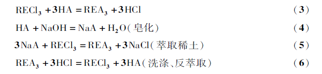 萃取分離過程主要利用有機萃取劑萃取料液中易萃組分,獲得高純度的難萃組分,通過洗滌有機相的難萃組分獲得純的易萃組分,達到分離目的。目前稀土分離均使用酸性萃取劑(HA),萃取過程可用反應(3)表示,為了提高和穩(wěn)定萃取劑的萃取分離能力,一般均對酸性萃取劑進行皂化后再與待分離的稀土料液進行萃取交換,過程為反應(4),(5),負載稀土的有機相用鹽酸進行洗滌