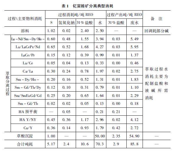 從目前的稀土分離基本工業(yè)流程,不難注意到,各段工藝間相對獨立,過程中消耗酸堿等化工原料和水,最終處理后作為廢水排放。以中憶富鋪稀土原料分離為例,典型試劑消耗如表1,每分離提純1噸稀土氧化物,消耗10噸左右的鹽酸、2. 4噸燒堿等化工材料,產生85噸廢水,其中含鹽量6. 8噸。