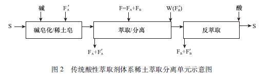 傳統(tǒng)酸性萃取劑體系稀土萃取分離流程,每一個分離單元的工藝如圖2所示,萃取劑有機相S需要用堿皂化,萃取難萃稀土A制取負載難萃稀土有機相,進人分離段交換萃取分離對象(A和B)中的易萃稀土B以獲得純稀土A水相,隨后用純易萃稀土B洗滌萃取劑有機相中的難萃稀土A以獲得負載純易萃稀土B的有機相,最后用酸反萃取使B轉型至水相,萃取劑有機相得到再生循環(huán)使用。