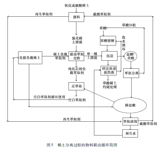 但是,聯(lián)動萃取分離工藝還不足滿足稀土分離的綠色要求,為此提出進一步發(fā)展聯(lián)動萃取分離工藝和實現(xiàn)稀土分離物料聯(lián)動循環(huán)的新設想。